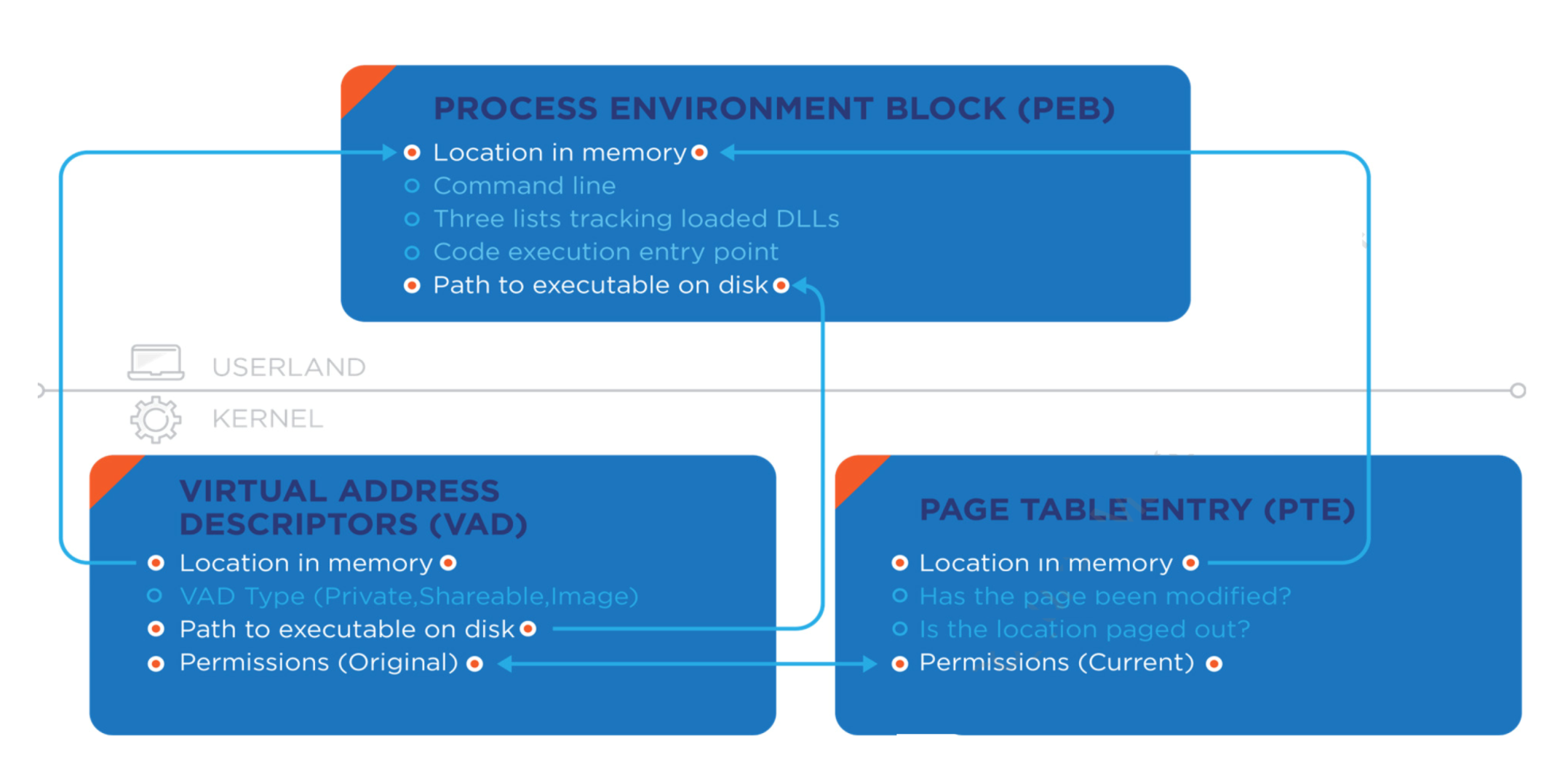 * PTE (page table entries) modification - normally through use of winAPI `NtProtectVirtualMemory` - allows attacker to allocate memory with `READWRITE` permissions and copy code to the location then switch to `READ_EXECUTE` (**VAD tree only uses the permissions when first starting the process but can be compared within the PEB**) &#x20;